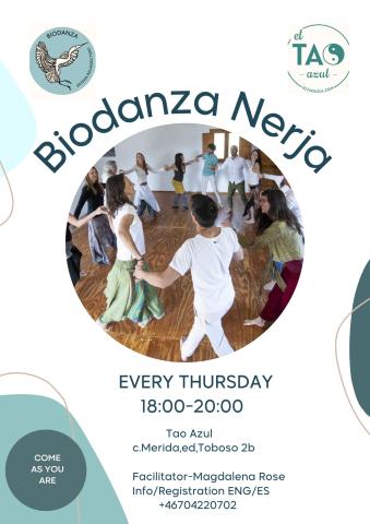 Biodanza: La Biodanza es un sistema de integración humana y renovación orgánica que utiliza la música, el movimiento y el encuentro en grupo para cultivar la vitalidad, la creatividad y la afectividad. Es una experiencia única que nos invita a reconectar con nuestra esencia más tierna y genuina, liberando la expresión y la alegría que llevamos dentro. Cada sesión es un viaje hacia la armonía, donde el cuerpo se convierte en el lenguaje del alma. Es una oportunidad para sanar, celebrar la vida y sentirnos uno con lo que nos rodea, tejiendo una profunda conexión con la naturaleza y con los demás. Te invitamos a vivir esta experiencia transformadora y a nutrir tu ser con la magia de la danza de la vida.